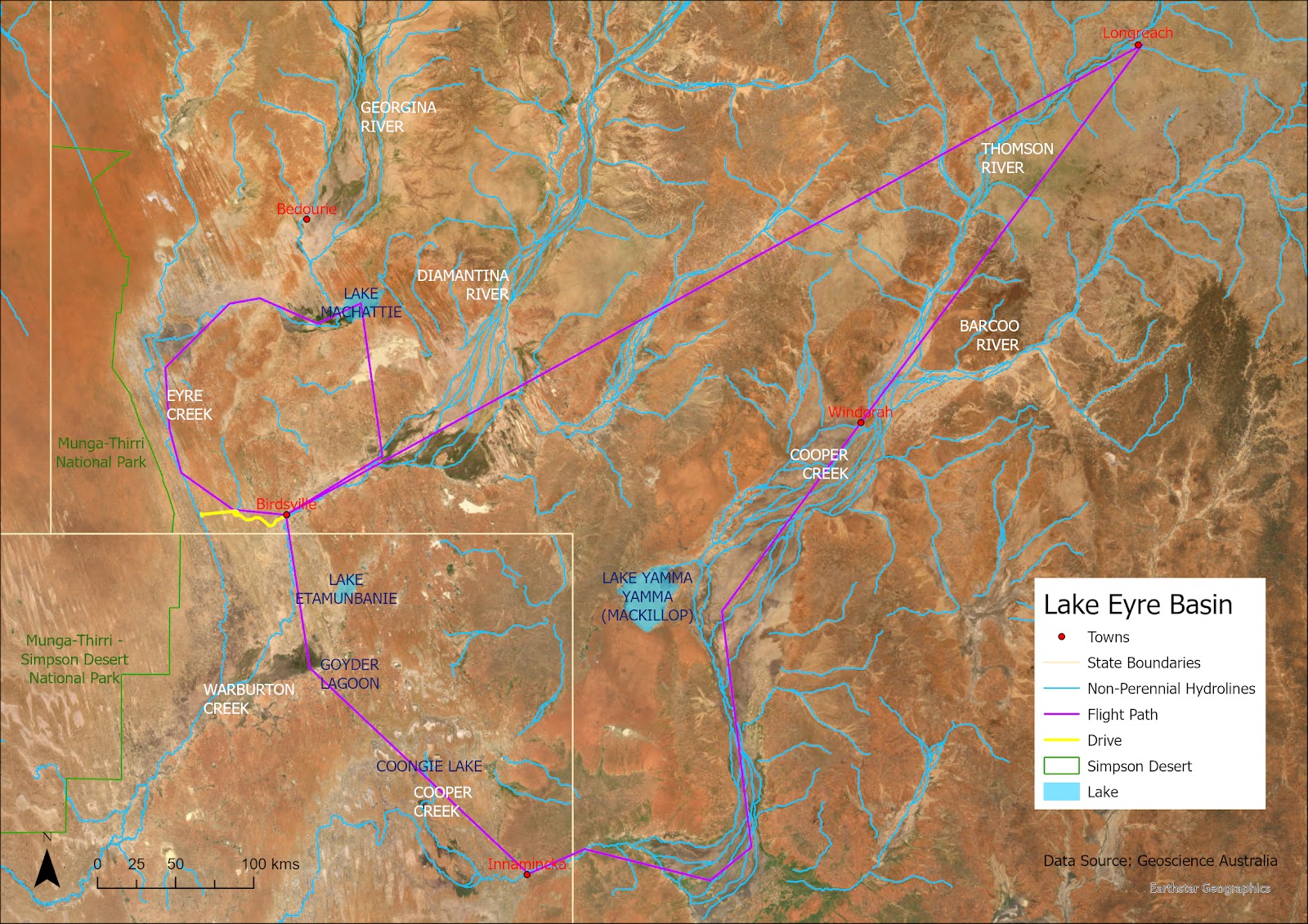 Day 3: Flight along Eyre Creek, Simpson Desert, then back over Lake Machattie and Diamantina rivers. Such widespread floods of the Georgina River, Eyre Creek, Diamantina and Cooper Creek river systems at the same time have not happened for decades.